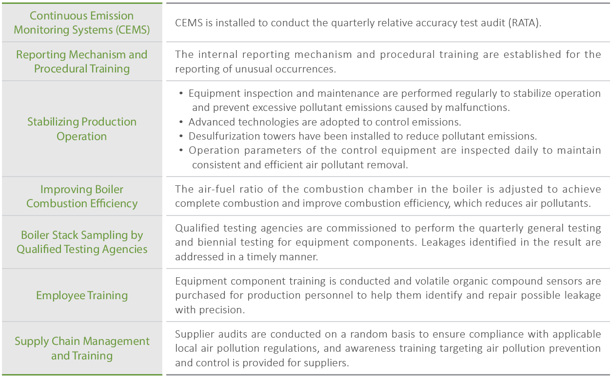 Continuously to introduce new technology on air pollution prevention and control, and examines existing facilities and production process regularly. To ensure regulatory compliance and help reach reduction targets.