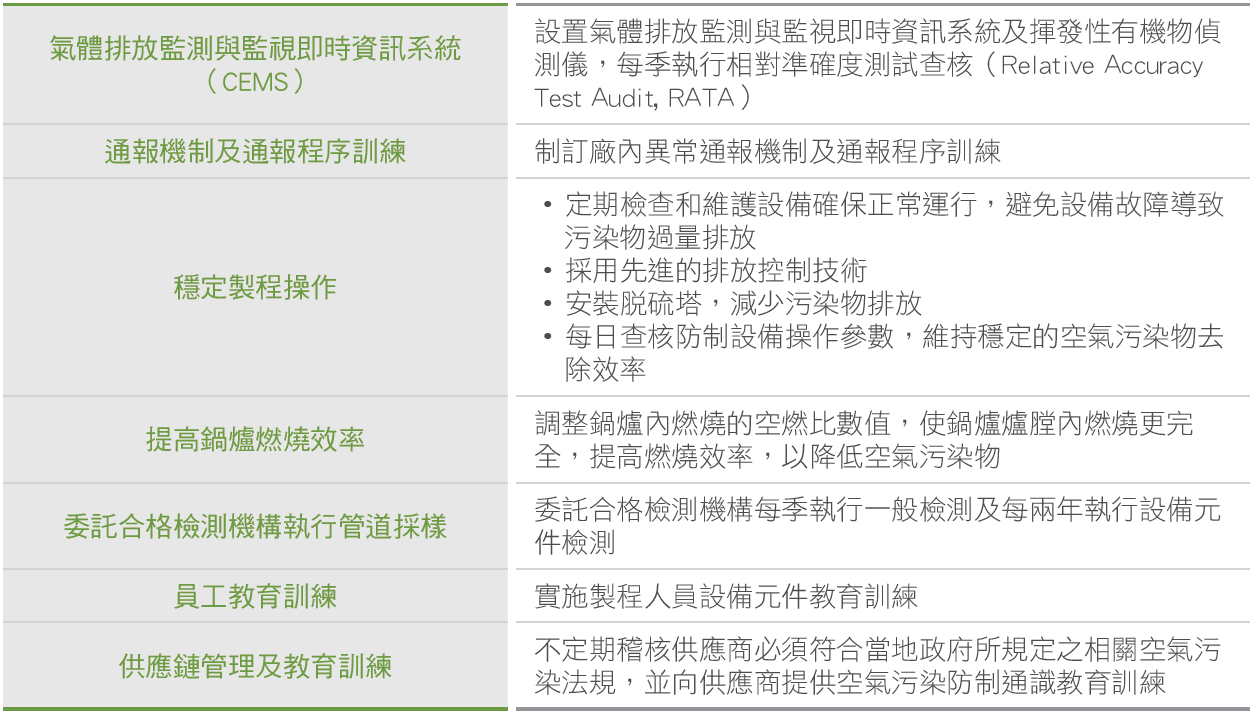 持續導入空氣污染防制技術,定期檢討現有設施及生產流程,確保各項排放符合法規規範,並以此達成減量目標