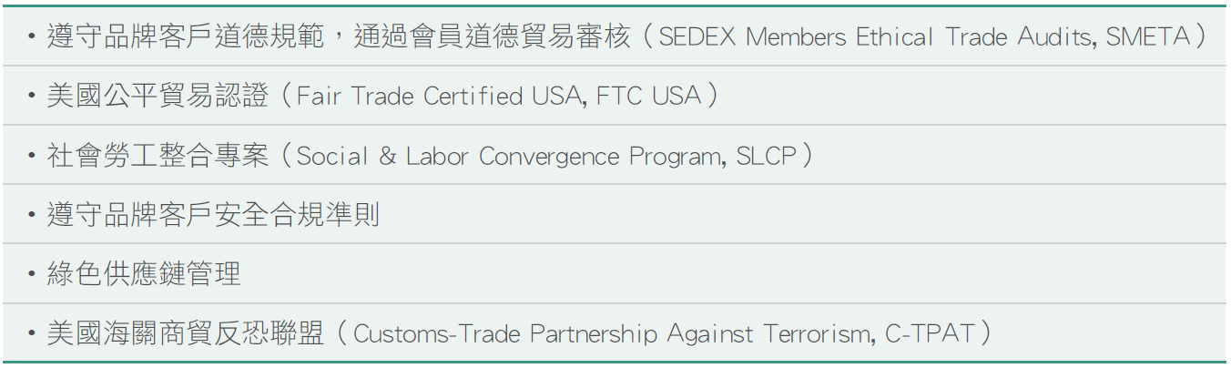 我們與品牌客戶簽署協議,力行遵守客戶所制訂的勞工、道德、安全、採購準則,督促自我提升。