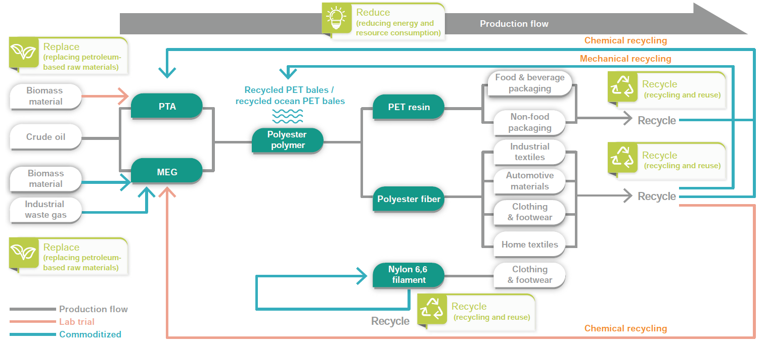 By cutting down waste, the global GHG emitted from waste treatment process can be effectively reduced. FENC has been deeply involved in the recycling industry for more than 30 years and has become a global leader in recycling polyester. The most representative products include rPET and its applications, as well as fabrics recycled polyester developed in recent years. In addition to the mechanical recycling technology, FENC has also adopted the more difficult polyester chemical recycling technology to separate waste polyester products mixed with other components through chemical processes, followed by polymerization and other processes to produce new polyester products.