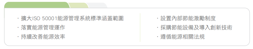 本公司台灣生產據點依循經濟部節電1%的目標,過往十年節電率皆達標。2025年1月2日經濟部公告2025至2028年能源用戶節能目標,契約用電容量逾1萬瓩的公司及國營事業,平均節電率目標提高至1.5%。本公司將持續優化能源管理系統,積極採取節能措施,以達成新的節能目標。
