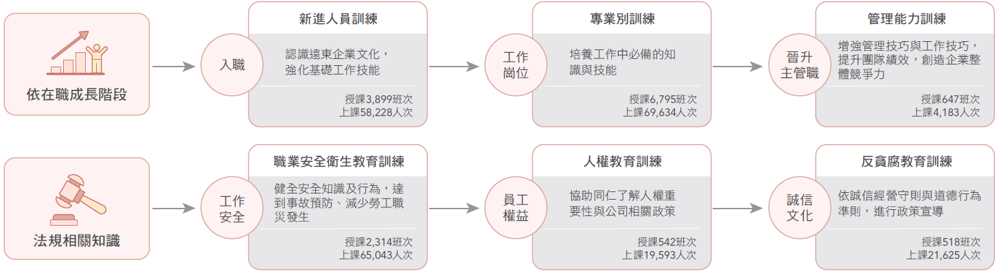 在不同專業崗位上,員工將接受專業領域訓練,並強化職業安全衛生與人權相關法規的學習,以打造健康、安全、合規的職場環境。當員工累積豐富經驗後晉升管理職,公司將即時提供新任主管培訓,協助其順利轉換角色,掌握管理關鍵能力,提前因應組織發展需求。