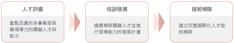 透過這套完整的人才培育機制,我們不僅提升接班梯隊的戰備力,更確保組織具備強大的競爭優勢,以迎戰未來的各項挑戰。