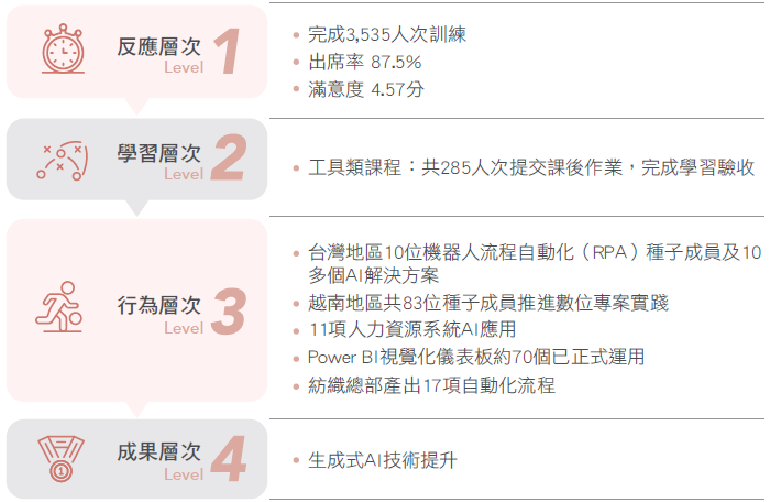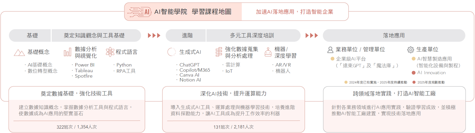透過系統化的學習地圖與分階段學習規畫,逐步培養員工的AI素養與應用能力,透過AI智能學院的全面推動,我們不僅強化員工的數位技能,更驅動企業數位轉型,邁向更高效、更智能的未來。