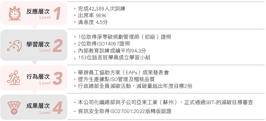 為響應公司明確的減碳目標,我們積極推動各階層必備的永續知識培訓,並持續開辦「淨零碳排」系列課程,鼓勵同仁取得專業認證與知能,包括 SBTi、ISO 14064、ISO 14001及Higg FEM 4.0等國際標準,強化環境管理專業能力。