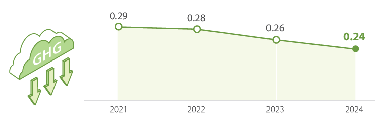 GHG Emissions per Unit of Production (tCO2e / metric ton of production) | 0.96 | 0.82 | 0.74 | 0.72 | 0.29 | 0.28 | 0.26 | 0.24 |