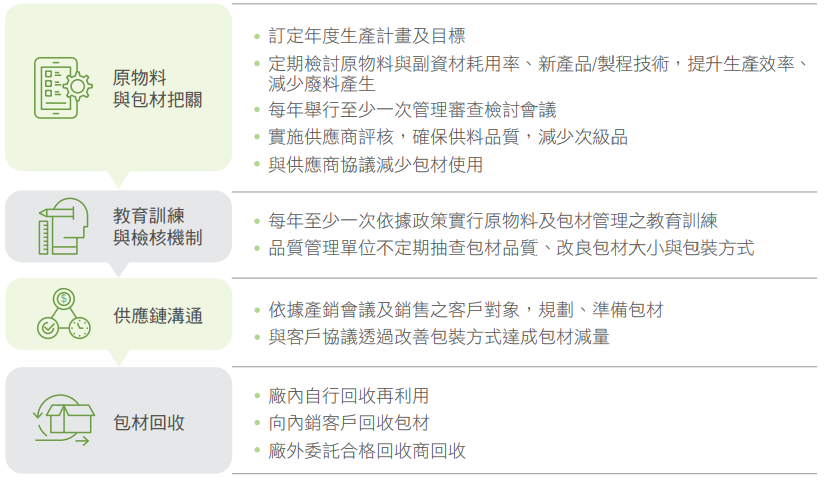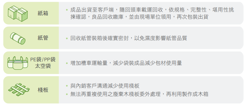 各生產據點制訂包材管理作業規範,依據客戶產品和運輸需求,選擇適合的材料及包裝方式。優先使用可回收或可重複使用的包材,並調整作業方式落實源頭減量。設定包材回收目標,每月統計包材回收量、回收率和達成率,檢討未達目標的項目。透過包材回收管理,延長包材使用週期,降低使用量和成本,減少廢棄物產生。除了自行回收再利用,我們也和供應商、客戶和回收廠商合作,由合格的回收廠商向內銷客戶回收包材,提供生產據點再次使用。