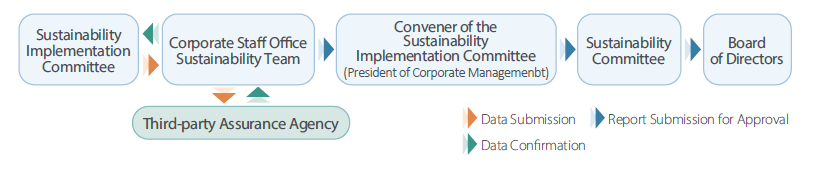 The annual sustainability performance disclosed in this report is first presented by the Sustainability Implementation Committee, which is then verified, analyzed and consolidated by the Sustainability Team at the Corporate Staff Office. The report is finalized and published after receiving third-party verification and approval from the President of Corporate Management. For the 2024 Sustainability Report, submissions for approval were made by the Sustainability Committee and the Board of Directors on April 23 and May 9, 2025.