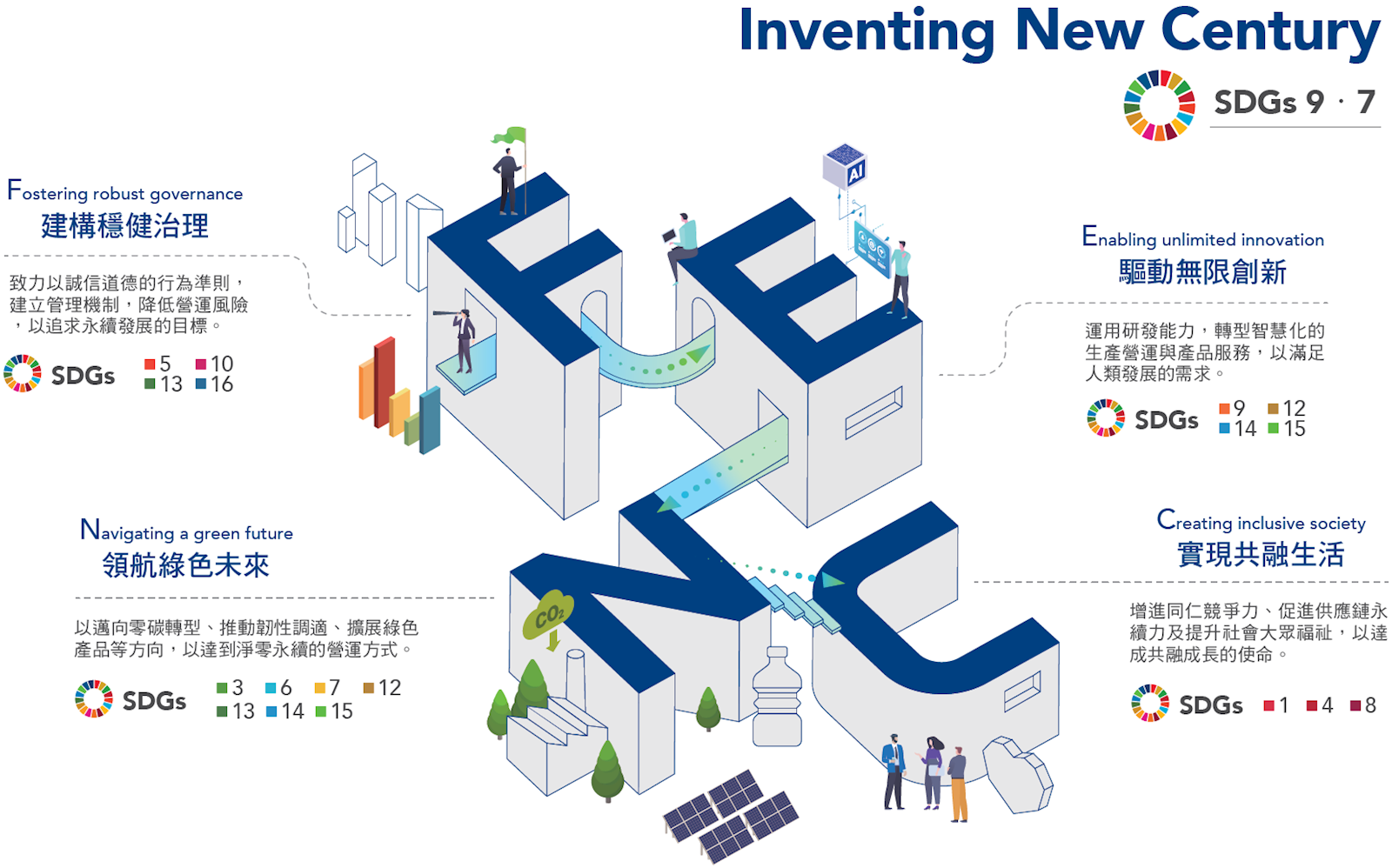 永續藍圖與政策 永續策略藍圖 企業永續發展政策 以聯合國永續發展目標(SDGs)為基礎,由企業永續推行委員會成員提出永續行動方案,共同完成遠東新世紀《永續策略藍圖》,回應15項SDGs,透過推動各項企業永續專案,與全球夥伴共同達成全球永續發展目標 繼續閱讀:企業永續發展政策回上頁