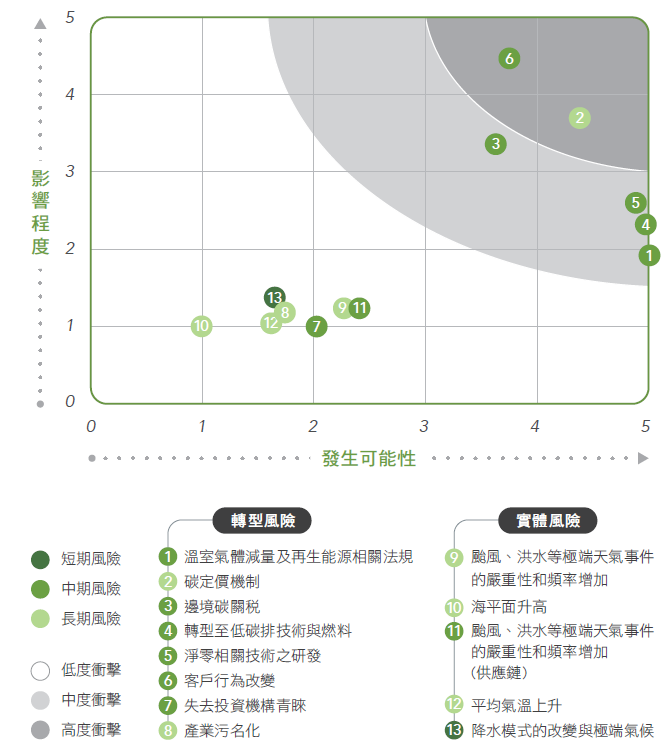| 9 | 實體風險 | 颱風、洪水等極端天氣事件的嚴重性和頻率增加 | 極端天氣造成設備受損,導致產能減少或維修費用增加 | 長期 |