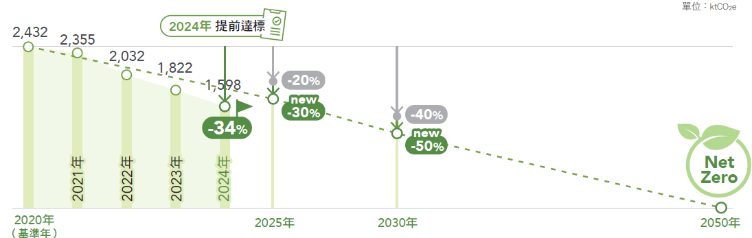 目標 | 為符合國際減碳趨勢並提升公司在淨零時代下的競爭力,遠東新世紀於2024年提高減碳目標,以2020年為基準年,範疇一及二溫室氣體排放量至2025年減少30%(短期目標),至2030年減少50%(中期目標),至2050年邁向淨零排放(長期目標) 本公司化纖總部以2022年為基準年,承諾於2030年範疇三的溫室氣體排放量減少42% 為呼應淨零願景、帶動產業鏈減碳,2024年訂定低碳轉型新目標:至2030年減碳50%、綠色原料佔比50%、綠色產品佔比50%,藉由原料、製程及產品的全方位低碳轉型,引領產業共創綠色未來。 |