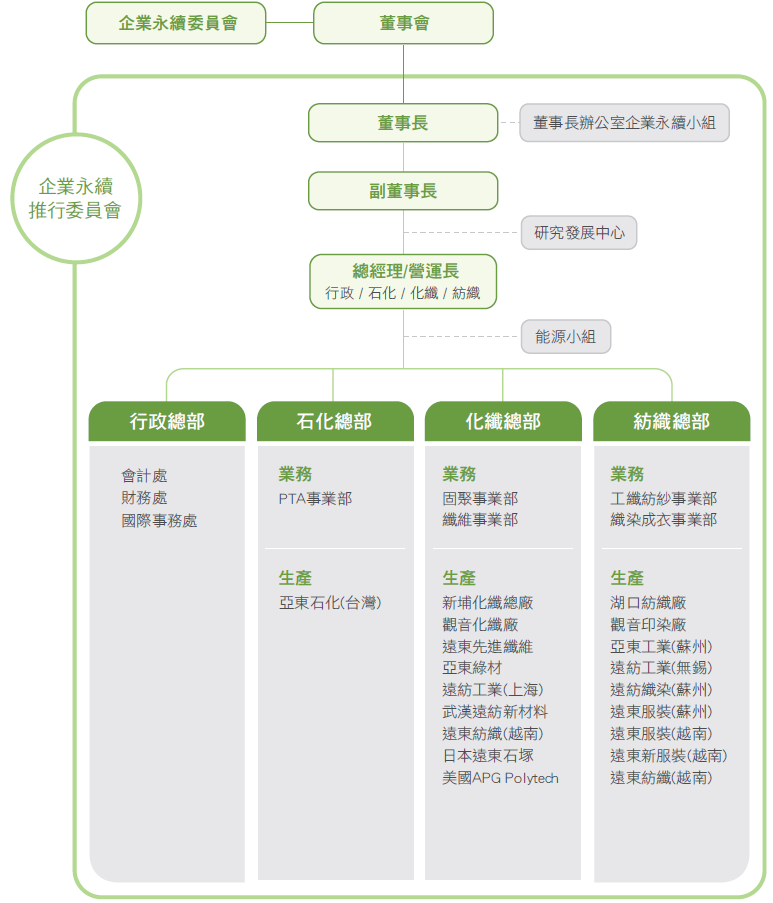 遠東新世紀氣候治理以董事會為最高層級,督導公司氣候變遷相關策略與管理方針,並設立董事會層級之功能性委員會-企業永續委員會。依公司組織設立「企業永續推行委員會」,行政總部總經理擔任召集人,由各事業總部生產營運據點、業務單位與行政部門共同推動本公司氣候風險減緩調適、低碳轉型以及環境風險管理;其中溫室氣體及能源管理相關業務由能源小組統籌;由董事長辦公室企業永續小組負責彙整各項永續績效,呈報至企業永續委員會及董事會;各事業總部總經理、營運長及能源小組每年至少一次於董事會及內部會議向董事會成員報告氣候變遷相關議題。