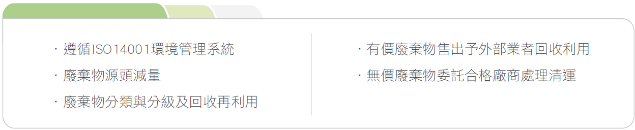 廢棄物清理符合相關法規規範,並依法申報數量。加強控管有害廢棄物,確實追蹤委外處理之有害廢棄物種類、數量、流向、儲存、利用、處置等,確保合法合規。