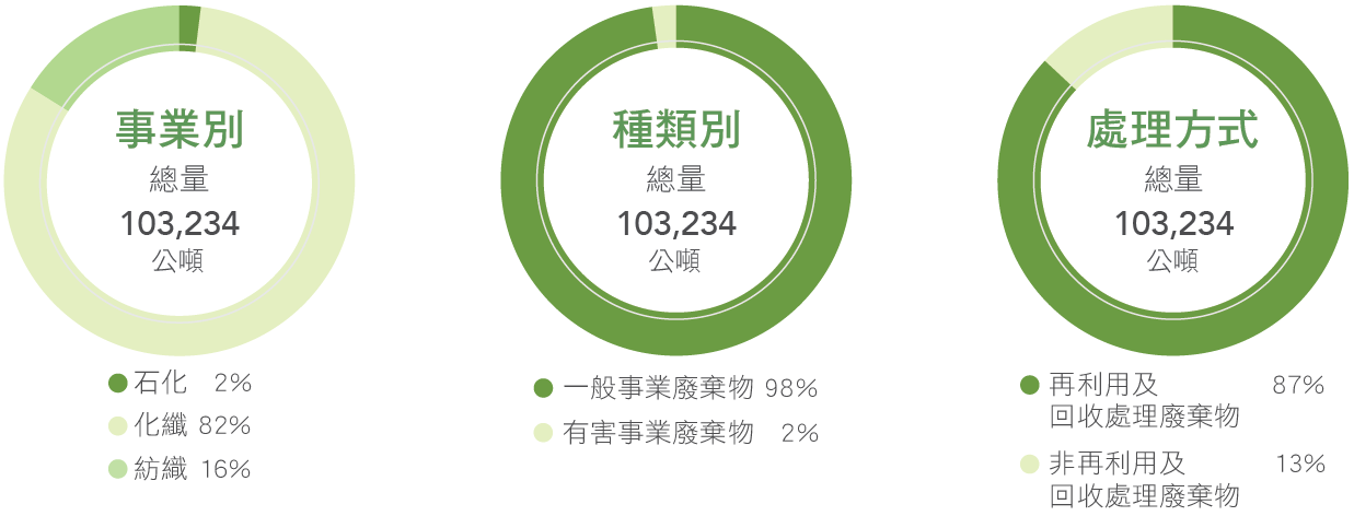 遠東新世紀致力於優化廢棄物管理,透過提升生產活動資源使用效率,從源頭減少廢棄物產生量,並提高製程廢棄物回收再製比率。管理原則為「人人做分類、垃圾自然少;無價變有價、有價變高價」。 - 廢棄物處理與回收