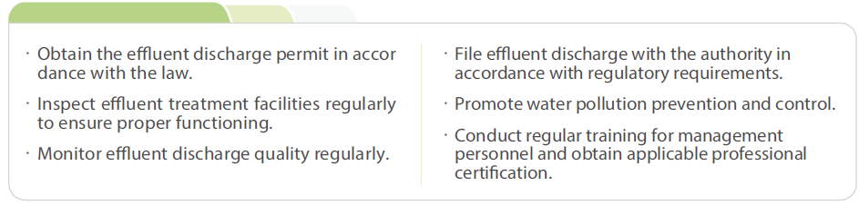 FENC has a comprehensive set of guidelines and operating procedures established to address effluent discharge. The Company conducts pollutant treatment with regular self-evaluation and testing that target an array of pollutants. Among them, those regulated by the local government are prioritized for treatment to keep the water quality in line with regulatory standards. Permits are obtained from the government authority prior to discharging the effluent into water bodies as stipulated by law, and the recycled effluent is for internal use only.