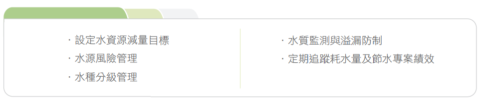 依據當地政府水情警示,如位處台灣之生產據點依據水利署水情燈號,展開水情應變措施,各生產據點亦建置緊急用水備援方案,2024年未發生因缺水而停產之情形。水情應變措施如下: