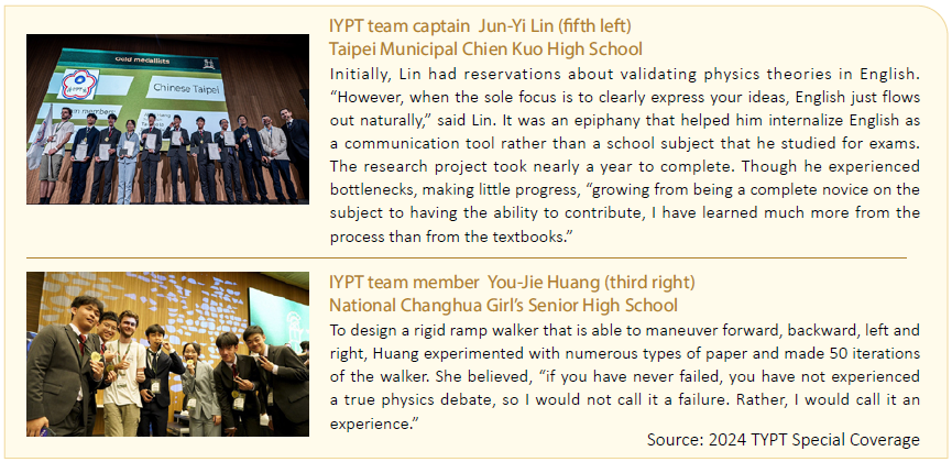 The K-12 Education Administration of Ministry of Education recognizes that TYPT as well as the International Young Physicists’ Tournament (IYPT) national team training and competition plan improves science competency among high school students, expands their world view and boost their competitiveness. Since 2023, the K-12 Education Administration has assumed the role of project advisor, encouraging the students and faculty members winning IYPT medals with certificates of recognition. The official recognition from K-12 Education Administration is beneficial in terms of cultivating talents in scientific research for the long term. It also attracts more top-performing students to compete, accumulating the momentum for scientific and technological innovation for the society.