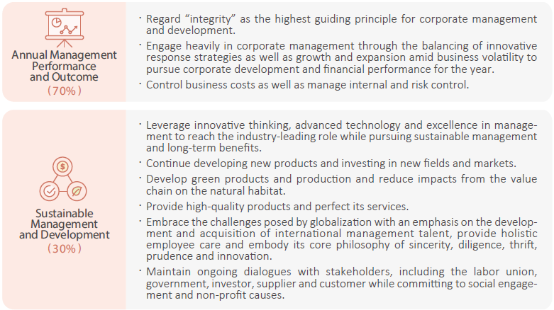 To ensure the effectiveness of its sustainable strategies, FENC conducts monthly team-based performance appraisal regarding material ESG topics. Based on the result, production bonuses as much as 20% of the monthly salary are awarded. The management level may earn performance bonuses for advancing the management systems, while for the rank-and-file employees, the bonuses are performance-based. The incentives are designed to encourage ESG practices among all units, including occupational safety, energy and carbon reduction, environmental protection, recycling and production optimization, which advance FENC’s sustainable commitment.