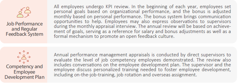 The employee performance management appraisals is conducted annually. Based on the business operation as well as employee performance and competency, adjustments are made to salaries, bonuses and promotions. The review mechanism serves to inspire employee dedication and create a win-win by increasing both personal earnings as well as corporate growth.