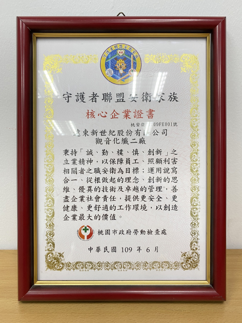 In 2017, Kuanyin Chemical Fiber Plant established Kuansin E Family to help staff identify occupational safety and health issues and make improvements. In 2020, the program has provided 77 recommendations, and 70 of which (90.9%) have been implemented. The Department of Labor of Taoyuan City Government invited Kuanyin Chemical Fiber Plant to take part in Observation of Core Members in Safety and Health Family and the 10 year celebration. During the event, representatives shared the plant’s role in ensuring safety and health as well as how to interact with the government and external agencies. Hung-Guo Wu, the director-general of the Department of Labor, Taoyuan City Government presented Safety and Health Contribution Award to Kuanyin Chemical Fiber Plant as a token of appreciation for our contribution to safety and health management.