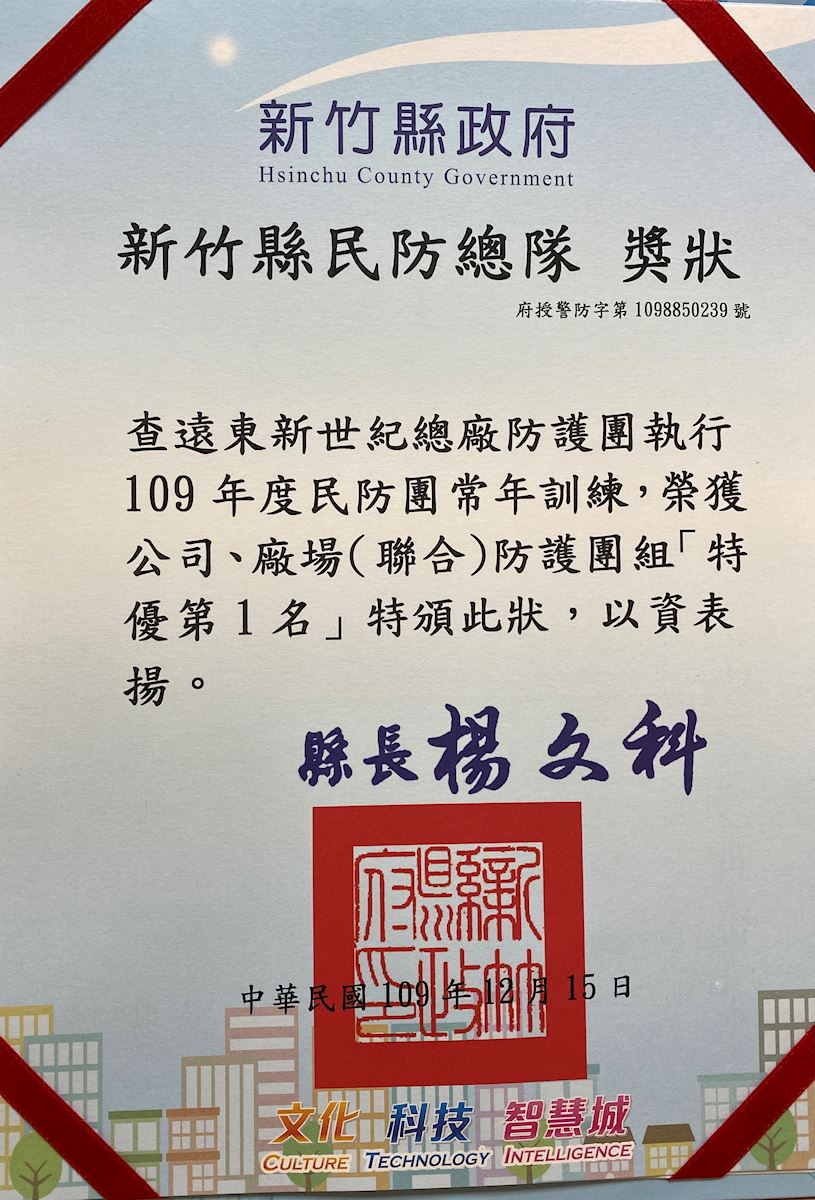 The civil defense system provides an effective way to help private citizens to defend and safeguard their lives and properties. In 2020, Hsinpu Chemical Fiber Plant received First Place in the Distinction for Company and Plant Defense from Hsinchu County Government; Hukou Mill received Third Place.