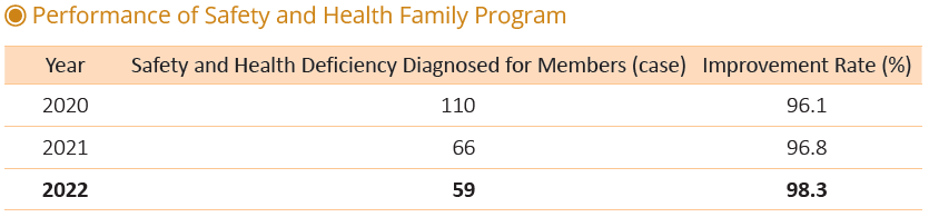 3. The plant helps members of the Kuansin E Family diagnose occupational safety and health issues and proposes improvement measures. As of the end of November 2022, the plant had provided 59 recommendations for improvements mainly associated with equipment and facility safety protection as well as regulatory management. Among them, 58 recommendations have been implemented and completed, reaching 98.3% in the improvement rate. Compared to the previous year, the total cases that require recommendations were down by seven, and the improvement rate increased noticeably by 1.3%.