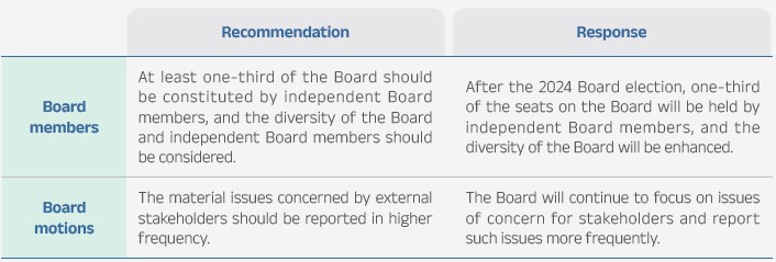 The Board performance is divided into three levels: “benchmark,” “advanced” and “basic.” The Board received the rating of “advanced,” “advanced” and “benchmark” for its performance in “structure,” “people” and “process and information,” respectively. The report, completed in January 2024, was presented to the Remuneration Committee on February 26 and the Board on March 5, 2024. The results also serve reference purposes in terms of the remuneration for as well as the nomination and renewal of the Board members. The recommendations from and responses to the evaluation are listed below: