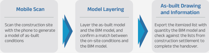 A construction project enters the handover stage once it is completed. However, with thousands of items on the handover checklist, reviewing them manually would be time- and labor-consuming. FERD has solved this problem by developing the digital real estate handover system, an innovative application that has received patent approval. The system allows the handover procedure to commence simply by using the mobile phone, which increases the efficiency dramatically.