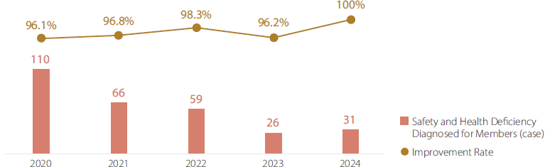 - Kuansin E Family provided strong member support, helping them diagnose occupational safety and health issues and proposing improvement measures. The 31 measures recommended in 2024 have all been completed, representing a 100% improvement rate. Compared with 2023, though the number of recommended improvement measures rose slightly, most employees showed support for these measures, a sign that the implementation of Labor Safety and Health Family Registry has raised the members’ awareness of occupational safety and health. The registry encourages self-management and self-evaluation, which is helping members maintain occupational safety and health while building a safety culture.